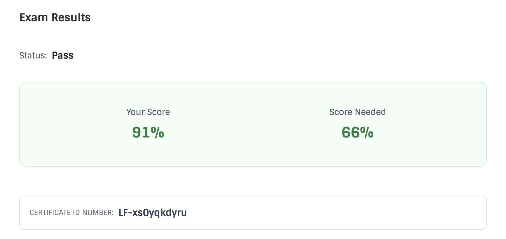 沒通過的原因其實就是不熟悉操作跟文件,所以調整了策略,以熟練考試方式為目標,訂閱了一個月的 KodeKloud Standard Plan,其中有包含 5 回 CKA 模擬試題,加上 Udemy 附贈的 3 回共 8 回。之後開始每天寫一回,重複練習到最後都可以穩定寫完一小時內寫完,兩週後重考就順利通過,分數為 91 分,一樣是完成考試約 24 小時後收到考試結果通知。